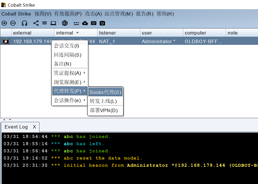 Step3 :CS选择"代理转发"点击"socks 代理";设置代理端口"自定义",点击确定