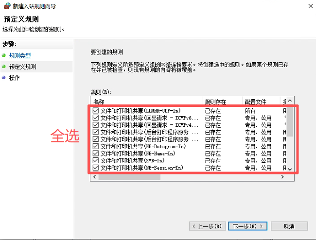 控制面板--->系统和安全 --->Windows防火墙--->高级设置--->入站规则--->新建规则--->预定义--->文件和打印机共享