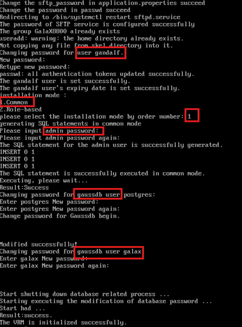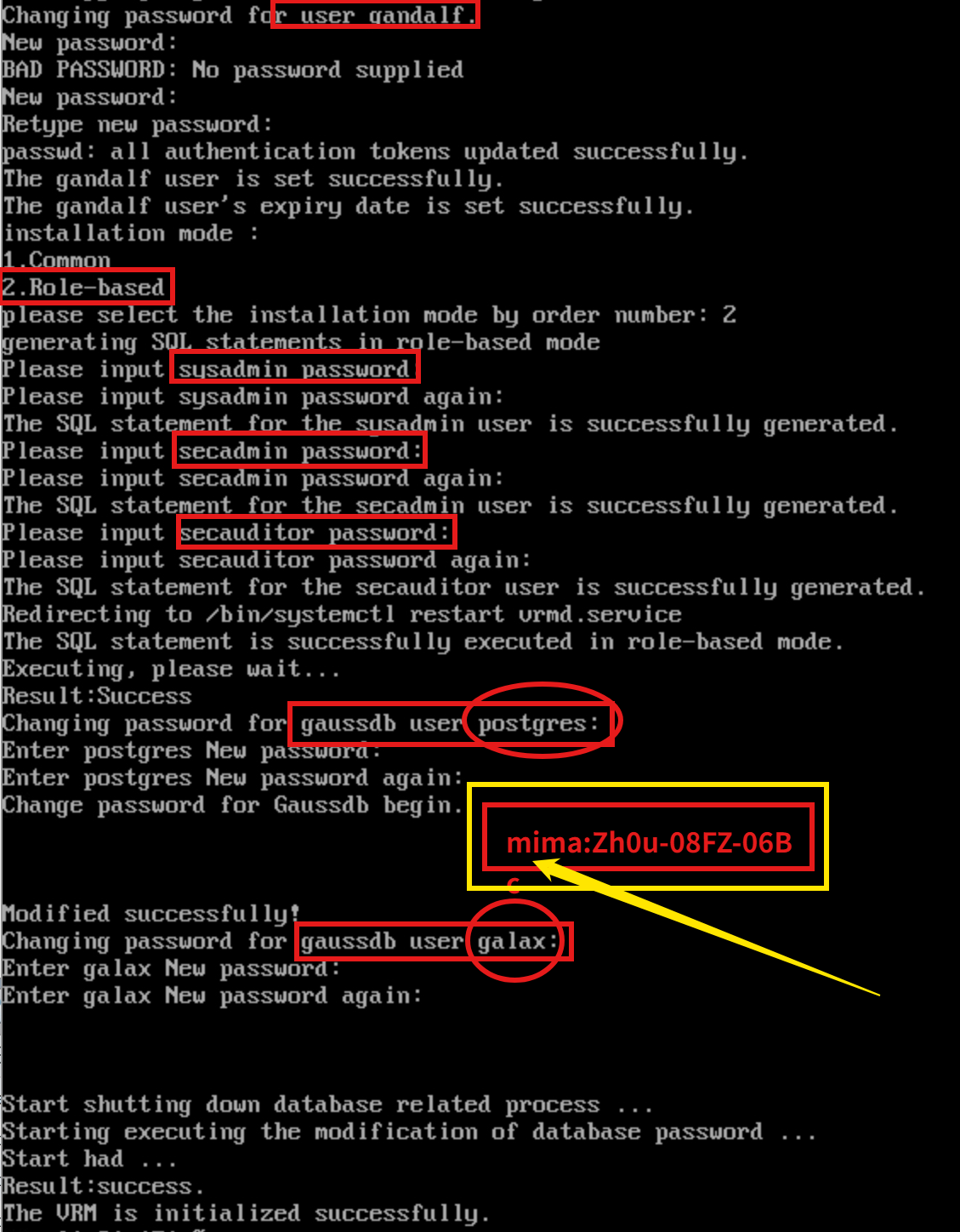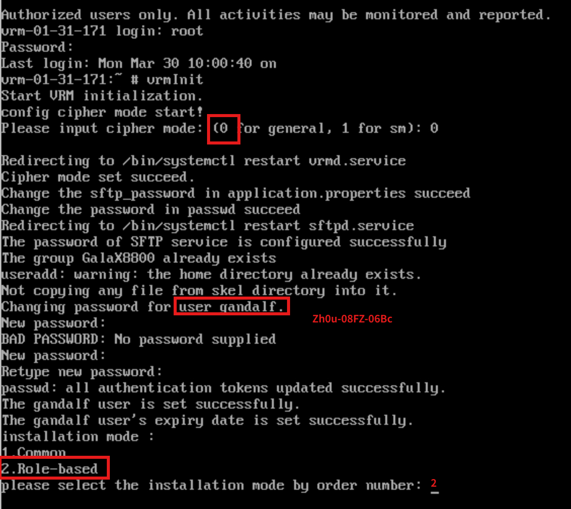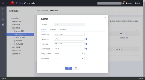 INFO\] : root ssh access is opened. \[INFO\] : open root ssh access. ## 三、安装VRM ### 3.1手动安装VRM #### 1.启动安装镜像  #### 2.进入配置界面  #### 3.编辑安装盘设置,选择安装磁盘,设置swap分区大小。  #### 4.配置网络  选择网卡  配置IP地址和掩码  配置网关  #### 5.配置主机名  #### 6.设置时区  #### 7.设置root密码  192.168.31.171/24/192.168.31.5(2026-03-30) 192.168.31.172/24/192.168.31.5 Root:Xxxx-xxxx-xxxx GRUB: Xxxx-xxxx-xxxx #### 8.设置Grub密码  #### 9.点击OK,开始安装 #### 10. 初始化VRM 1. 使用root用户登录CLI界面,执行以下命令,vrmInit,"I"为"i"的大写(初始化VRM,配置Gandalf、Portal、Gaussdb用户密码) vrmInit   我们输入"0" **Vrm-02 (2026-03-30)** Gandalf mima : Xxxx-xxxx-xxxx adminl user mima :Xxxx-xxxx-xxxx Gaussdb mima :Xxxx-xxxx-xxxx Gaussdb Galax user mima :Xxxx-xxxx-xxxx **Vrm-01 (2026-03-30)** Gandalf mima : Xxxx-xxxx-xxxx  sysadmin mima: Xxxx-xxxx-xxxx Secadmin:Xxxx-xxxx-xxxx Secauditor: Xxxx-xxxx-xxxx Gaussdb user: Xxxx-xxxx-xxxx Gaussdb galax user : Xxxx-xxxx-xxxx  **三权分立密码:** **192.168.31.172** **可用登录"** **sysadmin** **"** **Sysadmin** **:**Xxxx-xxxx-xxxx **Secadmin** **:**Xxxx-xxxx-xxxx **Secauditor:**Xxxx-xxxx-xxxx **Gaussdb user:** Xxxx-xxxx-xxxx **Gaussdb galax user :**Xxxx-xxxx-xxxx  **解释说明:** Admin:IaaS@OS-CLOUD9! · admin:用于登录 Web 管理界面(https://VRM_IP:8443)。 · gandalf:用于 SSH 登录 VRM 虚拟机操作系统(默认密码通常为 IaaS@OS-CLOUD9!)。 · root:VRM 节点操作系统超级用户(默认密码通常为 IaaS@OS-CLOUD8!)。 1. 补充-不是主步骤:将 admin用户的密码重置为默认出厂值(IaaS@PORTAL-CLOUD8!)。 psql -U galax vrm -c "update sm.tbl_user set password='ed1a53af6f94d460ae36d39157e84d8bw+MJmGLcUz02' where username='admin' and usertype='0';" 系统会提示输入数据库密码,输入:SingleLOUD!1(根据设定) **执行成功后,终端会显示 UPDATE 1** **。**  #### 11. 配置VRM节点规格(也就是内存规格) 执行以下命令,进入/opt/galax/root/vrm/tomcat/script目录。  cd /opt/galax/root/vrm/tomcat/script/ 执行以下命令,运行配置脚本。 sh modifyVrmNodeMemory.sh M 1. 配置VRM内存规格 **内存规格按如下取值范围进行设置:** 1. · M:6GB≤VRM节点内存<8GB 2. · L:8GB≤VRM节点内存<16GB 3. · XL:16GB≤VRM节点内存<30GB 4. · XXL:VRM节点内存≥30GB  **3.1.1** **主备** **VRM** **配置** 1.安装两台VRM 2.使用浏览器登录主VRM的:IP地址:8443  3.使用admin用户登录  登录到管理界面  4.选择"系统管理 \> 系统配置 \> 服务和管理节点"。在"服务列表"中"VRM服务"所在行后单击"主备配置"。  "节点参数"页面,输入本端和对端IP和主机名等信息  "管理平台"页面,输入浮动IP  "仲裁IP地址"页面,输入仲裁IP地址。  注:仲裁IP地址用于判断主备VRM节点活动状态的IP地址,至少填写一个,最多填写3个。建议将第一个仲裁IP地址配置为管理平面的网关,其他仲裁IP地址配置为与管理平面互通的全局服务器的IP地址,如AD域服务器、DNS服务器。 开始配置VRM节点主备关系。配置约耗时5分钟,期间FusionCompute无法正常使用。 **3.2Web** **安装** **VRM** **3.2.1** **启用安装工具** 通过gandalf用户,使用WinSCP等工具,上传LinuxInstaller工具文件 切换指root用户,使用unzip命令解压LinuxInstaller工具文件  切换到解压的路径,运行命令sh bin/webInstaller.sh install  **3.2.2** **自定义安装** 登录CNA节点下的安装工具:https://\<CNA_IP\>:8080,输入用户名密码:admin\\IaaS@PORTAL-CLOUD8!  修改密码  登入操作界面  点击"自定义安装",勾选安装组件,点击下一步  **主机安装** 说明,点击下一步  上传安装包,选择CNA的iso镜像,点击开始上传  上传完成点击下一步  设置或默认swap分区大小,点击下一步  点击"添加"按钮  输入要安装CNA的节点的BMC信息,点击确定  点击下一步  配置IP地址池和各用户密码,点击"配置服务"按钮,完成后点击下一步  勾选CNA节点,点击"开始安装"按钮  现在正在安装......  安装完成,点击下一步  **VRM** **安装** 说明,点击下一步  选择VRM的zip安装包,点击"开始上传"  上传完成,点击下一步  选择安装模式,点击下一步J0y0ud@t@  填写VRM管理信息,点击下一步  选择主备节点,并输入节点root密码,点击"开始安装VRM"  注意:主备CNA之间需要设置相同时间,否则报错 **3.2.3** **一键安装** 选择"一键安装",点击下一步  上传CNA.iso和VRM.zip安装包,点击下一步  输入swap分区大小,地址池,及各用户密码,点击"录入节点信息"  输入CNA节点的BMC新和管理信息  输入VRM信息,点击下一步  点击"开始安装"按钮  安装主机成功  VRM部署完成,点击下一步   添加主机: 这里的密码,6版本指的是gandalf的密码,而8版本开始,指的是root的密码。