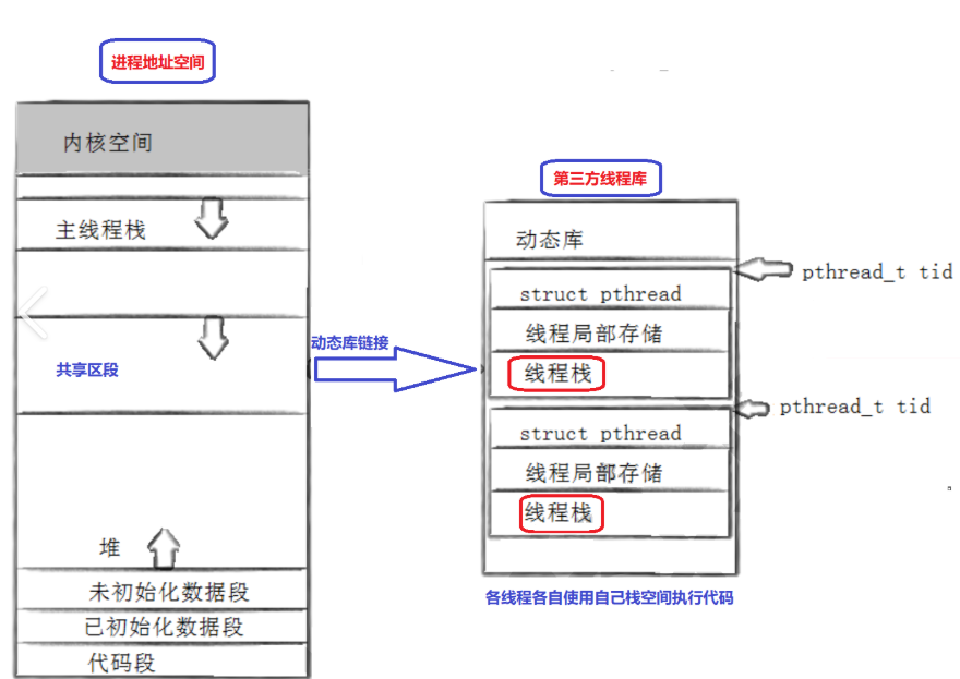 Linux提供了轻量级进程相关的系统调用,可是我们用户只想用线程怎么办?于是有了pthread库------用户级线程库,为我们提供管理线程的接口和参数,向下调用Linux的轻量级进程系统调用。