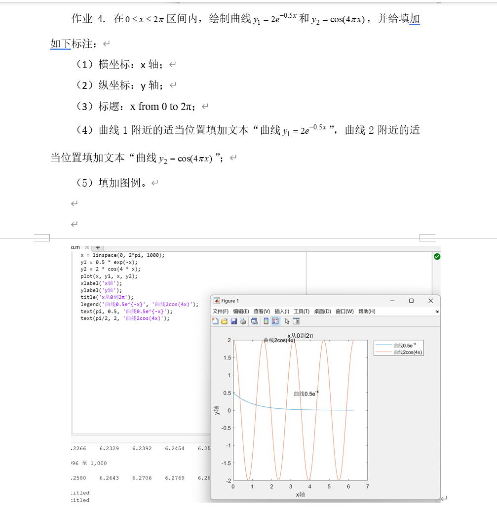 图形标注与美化是实验的重要环节。为曲线添加坐标轴标签、标题、文本说明和图例,不仅能让图形更规范,还能清晰传达图形的含义。通过 xlabel、ylabel、title、text、legend 等函数的使用,我掌握了 MATLAB 图形标注的基本规范,理解了可视化的核心是让观者快速理解数据与函数的关系。同时,文本位置的微调、图例的合理布局,让图形的可读性大幅提升,也让我认识到细节处理在数据可视化中的重要性。
