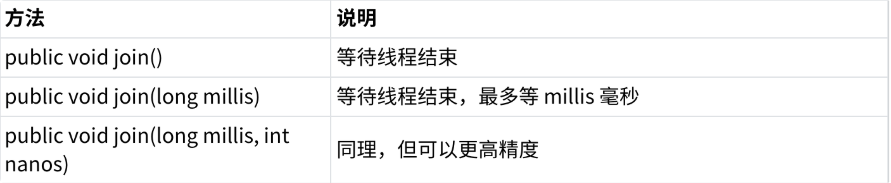 除了以上不带参数的 join() 方法外,还有带参数的版本,指定了"超时时间" ,即等待的最大时间,超过这个最大时间,就不再等待。