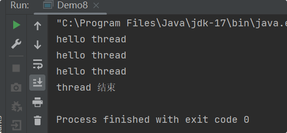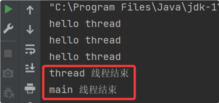 这样无论怎么重新运行,输出的结果都是 thread 线程先结束: