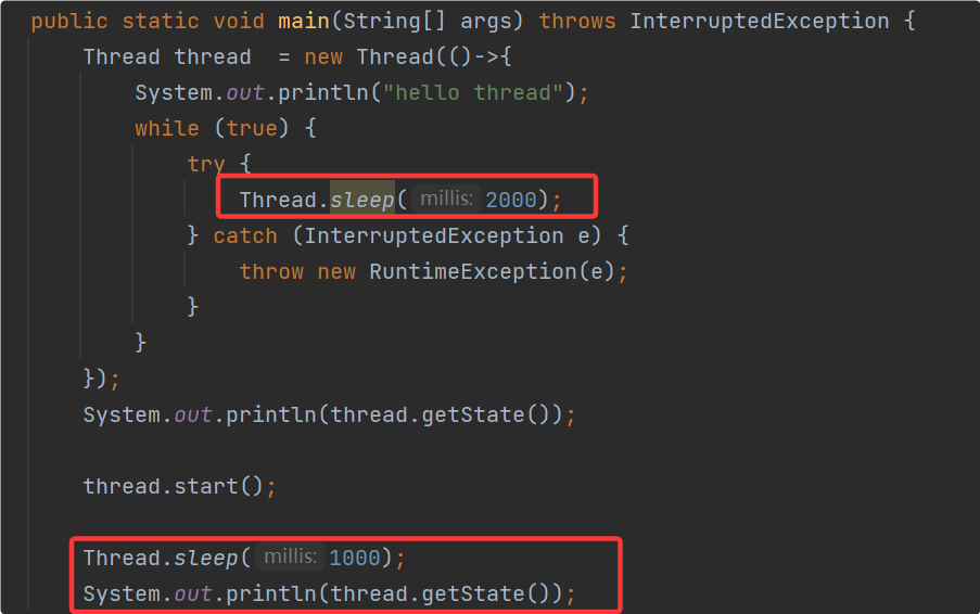 注意:sleep方法是静态方法,通过 类名.sleep ,即Tread.sleep() 调用。