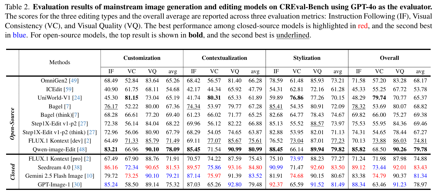 实验分别在开源和闭源的主流生成模型上进行测试,实验结果显示各模型各有所长。在闭源模型中Seedream4.0表现最佳,Gemini-2.5-flash-image在视觉一致性维度最佳,GPT-image-1由于在视觉一致性表现不佳导致总分被拉低;在开源模型中Qwen-image-Edit和FLUX.1 Kontext [dev]表现较好,其中FLUX的视觉一致性表现要优于Qwen-image-Edit,而表中的UniWorld-V1的VC指标最高是因为该模型在复杂指令的创意生成任务上的能力不足,导致生成图与原图的差异不明显,因此不具有参考价值。