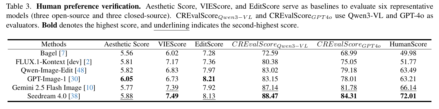 另外,本文进行了人类偏好验证。为了验证方法有效,除了GPT4o外,还选择了Qwen3-VL作为评估器,实验表明CREval方法与人类偏好一致。Qwen-Image-Edit和GPT-Image-1两个模型表现相近。