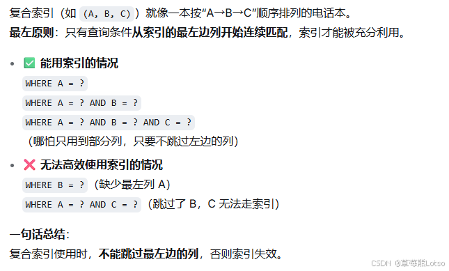 复合索引遵循 最左前缀原则 ,只有从第一列开始连续匹配才能被有效利用;如果索引 包含了查询所需的所有列(覆盖索引) ,就能 避免回表,直接返回结果。