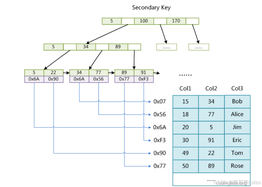 - 辅助索引叶子节点存储:主键值