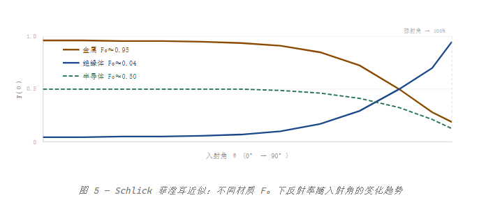 菲涅耳方程描述了反射率随入射角变化的规律。Schlick 近似在保持高精度的同时大幅降低计算量:
