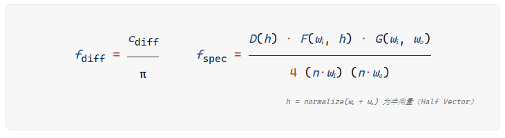 Cook-Torrance 模型将 BRDF 分解为漫反射(Diffuse) 与**镜面反射(Specular)**两部分: