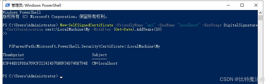 -DnsName "localhost":这是最重要的参数之一。指定证书要绑定的域名或主机名。如果你是通过 IP 地址(如 127.0.0.1)或具体计算机名访问网站,请务必将 localhost 替换为对应的值。
