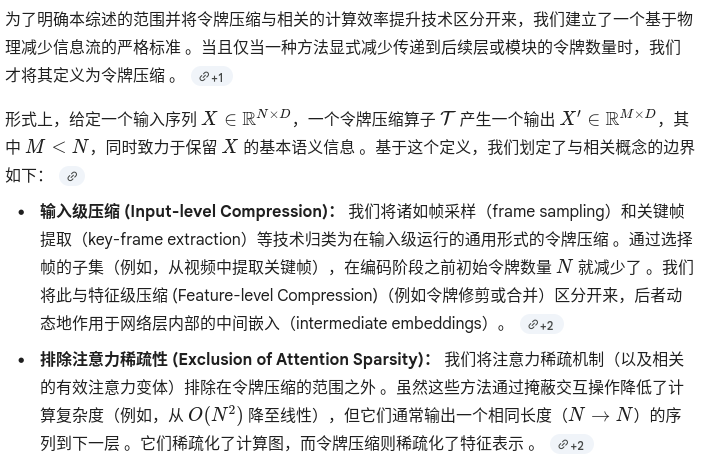 为了应对长上下文带来的挑战,令牌压缩已成为提高 MLLM 推理效率和实际部署的关键研究重点。这种方法非常有效,因为像视觉 Transformer(ViT)处理的那些多模态输入包含大量的冗余(Rao 等,2021;Liang 等,2022;Bolya 等,2022;Ryoo 等,2021;Touvron 等,2021;Vaswani 等,2017;Yang 等,2025d)。例如,广泛的研究表明,在典型的 MLLM 序列中,超过 50% 的令牌在推理过程中几乎受不到关注(Chen 等,2024a;Huang 等,2025c;Tao 等,2025a;Shao 等,2025;Alvar 等,2025;Shang 等,2025)。尽管一些先进技术将压缩直接集成到模型的架构或训练框架中(Chen 等,2024c;Dai 等,2024;Wang 等,2024c;Bai 等,2025;Li 等,2025a;Zhang 等,2024d;Cai 等,2024a;Yao 等,2024;Cha 等,2024;Chu 等,2023;2024a;Li 等,2024d),但令牌压缩的一个主要优势是它可以作为一种后优化技术应用,而无需昂贵的重新训练。这些方法通常首先建立一个专门的指标来评估令牌的重要性,然后执行相应的修剪或压缩。通过显著加速推理并减少内存消耗,这些技术使得 MLLM 在现实世界应用中的实际部署成为可能(Lin 等,2025a;Chu 等,2023;2024a;Wei 等,2025;Ma 等,2024b)。