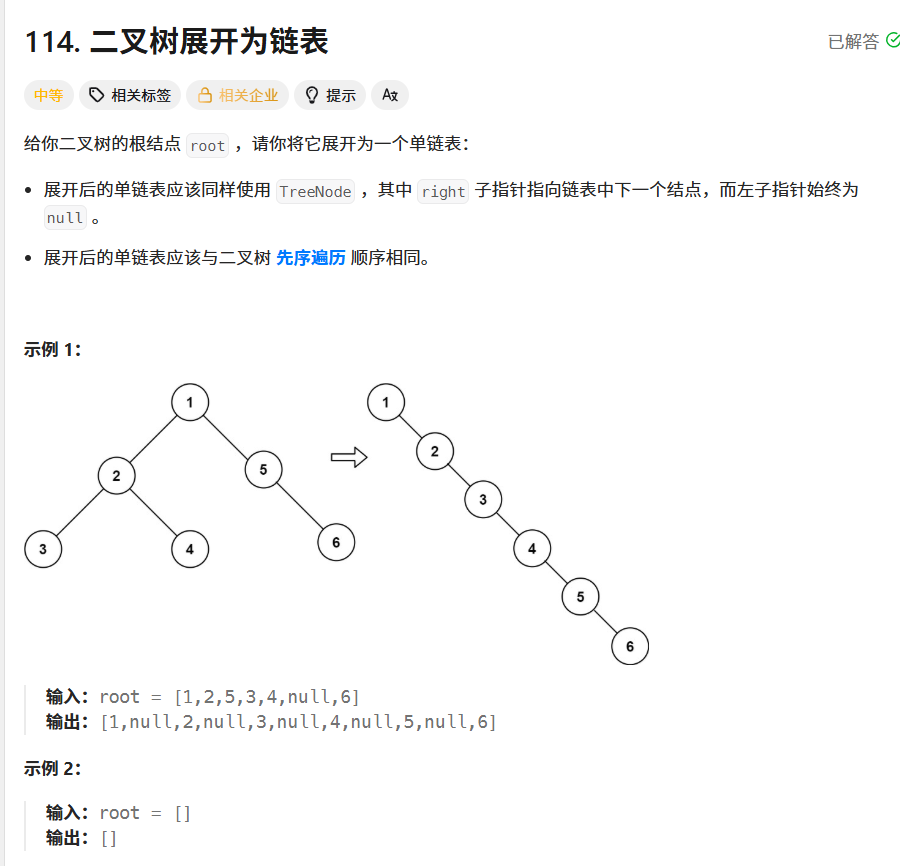 这个题是这样的,他要按照链表那个样子排序,其实这个和前序遍历顺序是一样的,前序遍历是根左右这样的顺序进行的,他不是会不断递归到最左边的孩子嘛,到最左边的孩子之后再回溯根节点再到根的右边,那么咱们只需要利用这一点,把右子树的节点依次插在左子树最右边的右边,不断这样子来,走完一个节点就将左子树清空,右子树变成那个新形成的子树节点;然后对下一个节点继续这样子;
