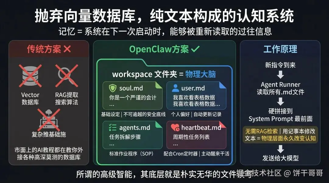 现在市面上的 AI 教程,都在教你怎么给大模型外接各种高深莫测的数据库。但是 OpenClaw 直接用几张文本文档打烂了这些伪需求。