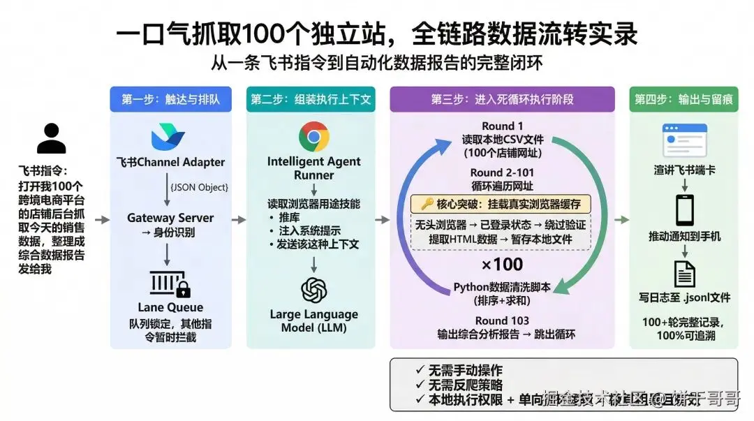 现在我们用openclaw,在飞书里给大模型发了一条指令:打开我100个跨境电商平台的店铺后台抓取今天的销售数据,整理成综合数据报告发给我。