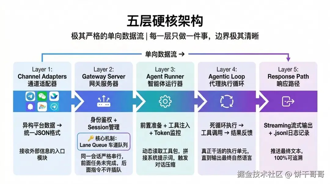 把刚才推演出来的组件合在一起,就是OpenClaw极其严谨的单向数据流五层架构: