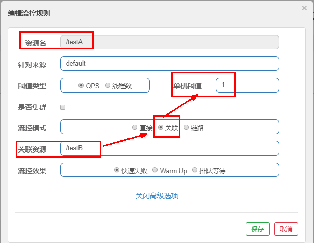 当关联的资源达到阈值时,就限流自己。当与A关联的资源B达到阀值后,就限流A自己。