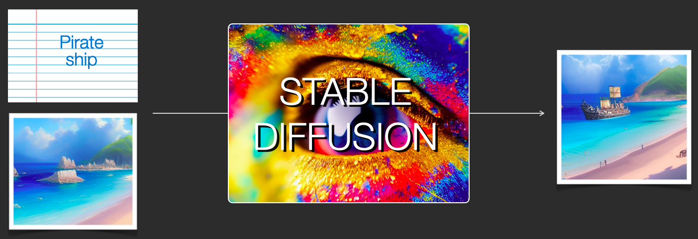 另一个主要用途是修改图像(即输入文本+图像),下图展示的是在原有图像上+提示词:Pirate ship,生成一张改写的图,实现对原图的修改效果。