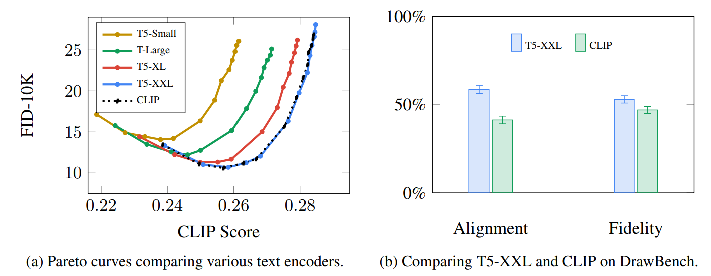 Imagen论文表明,语言模型的选择至关重要。与更大的图像生成组件相比,替换为更大的语言模型对生成图像质量的影响更大。