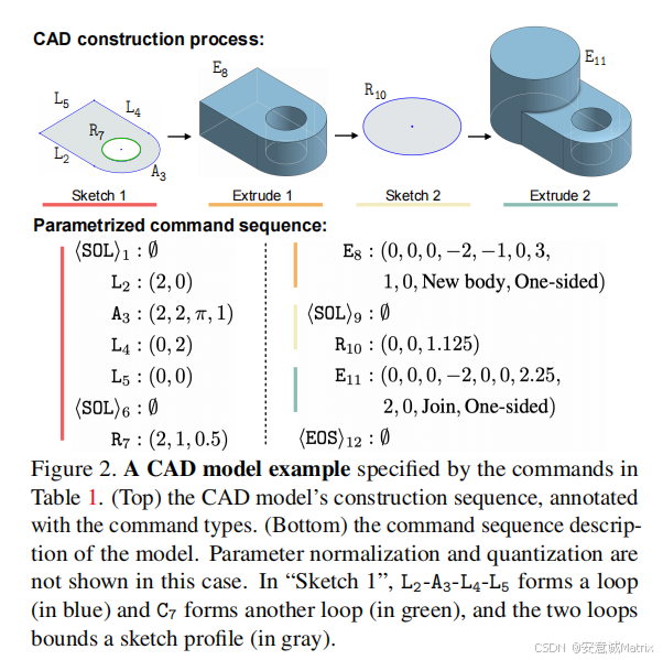 结合立方体建模,两种场景的输入、输出具体格式及内容如下,严格遵循DeepCAD的标准化规则(60条定长序列、16维参数向量,未用参数设为-1,连续参数量化为8位整数):