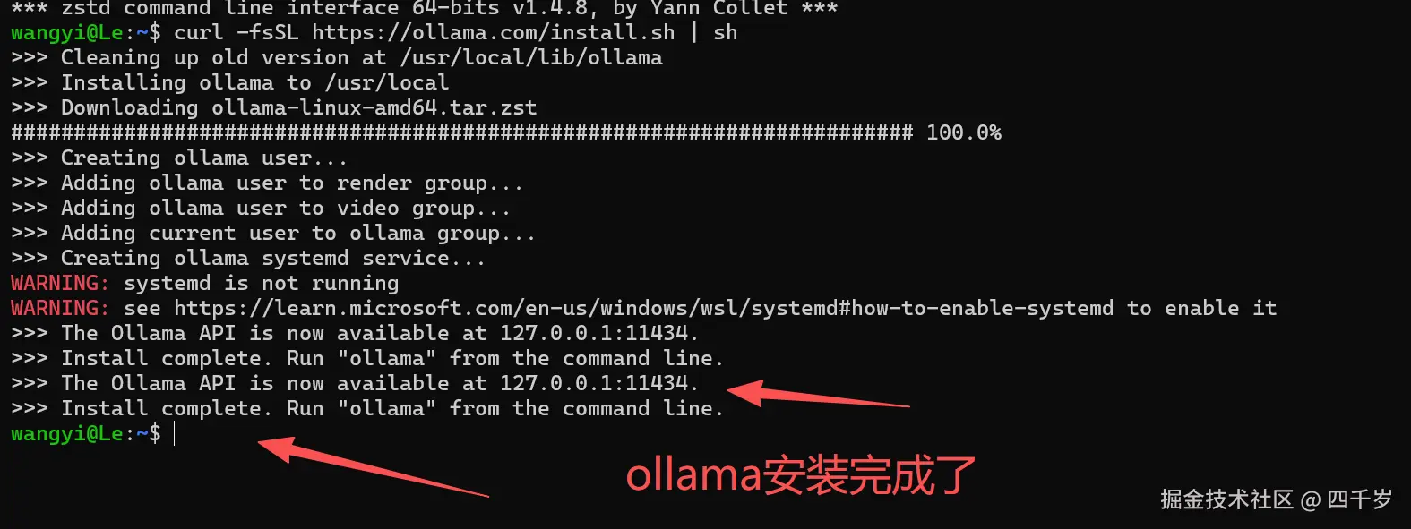 ollama已安装完成,但还需为 Ubuntu 安装systemd系统管理工具(ollama的运行依赖该工具)。