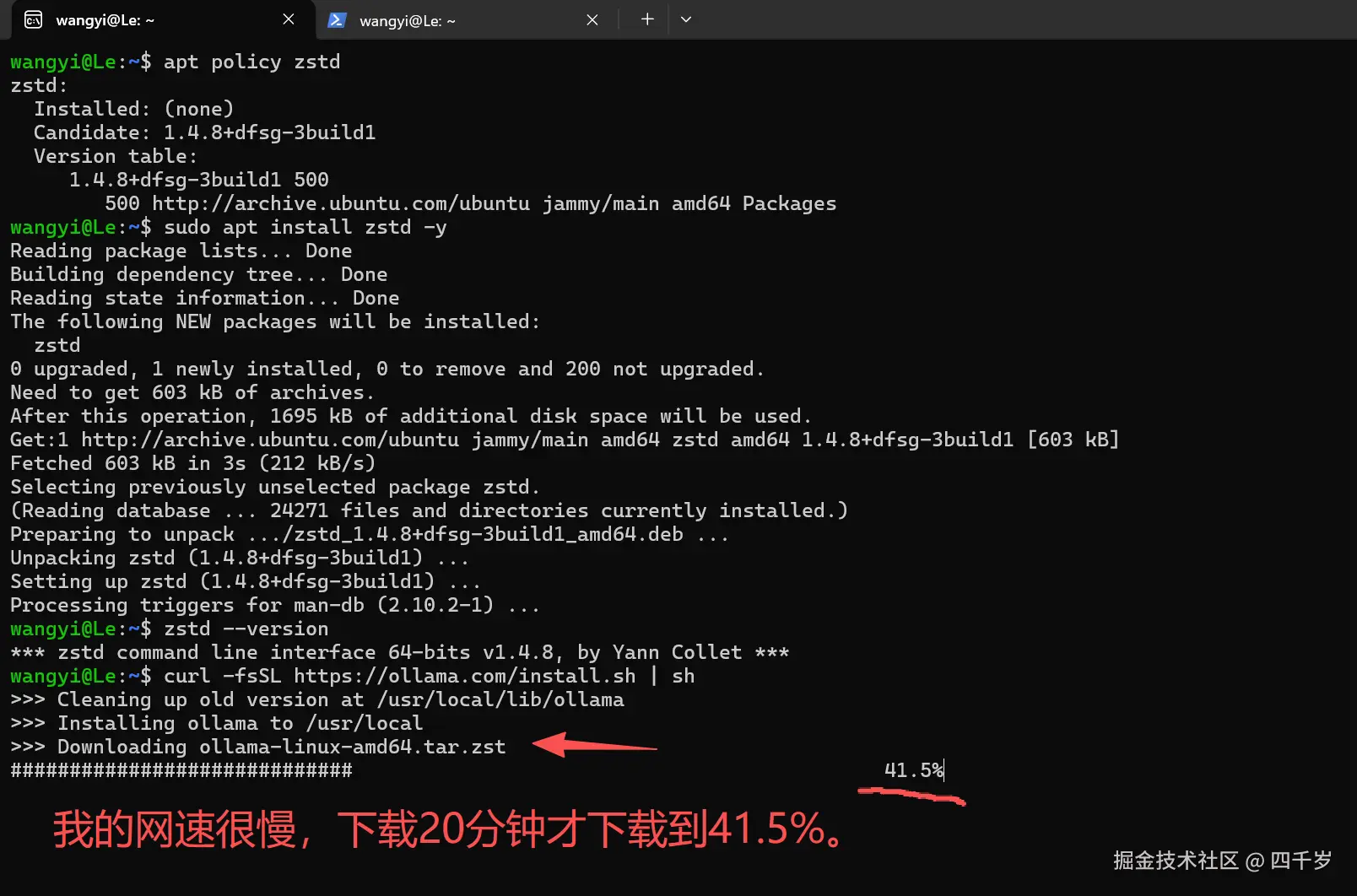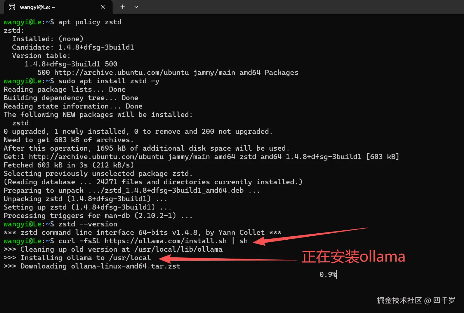zstd是 Linux 上面的一个超快、压缩率很高的文件压缩工具,Ollama的安装依赖zstd。所以,我们首先要在 WSL 里面安装zstd。