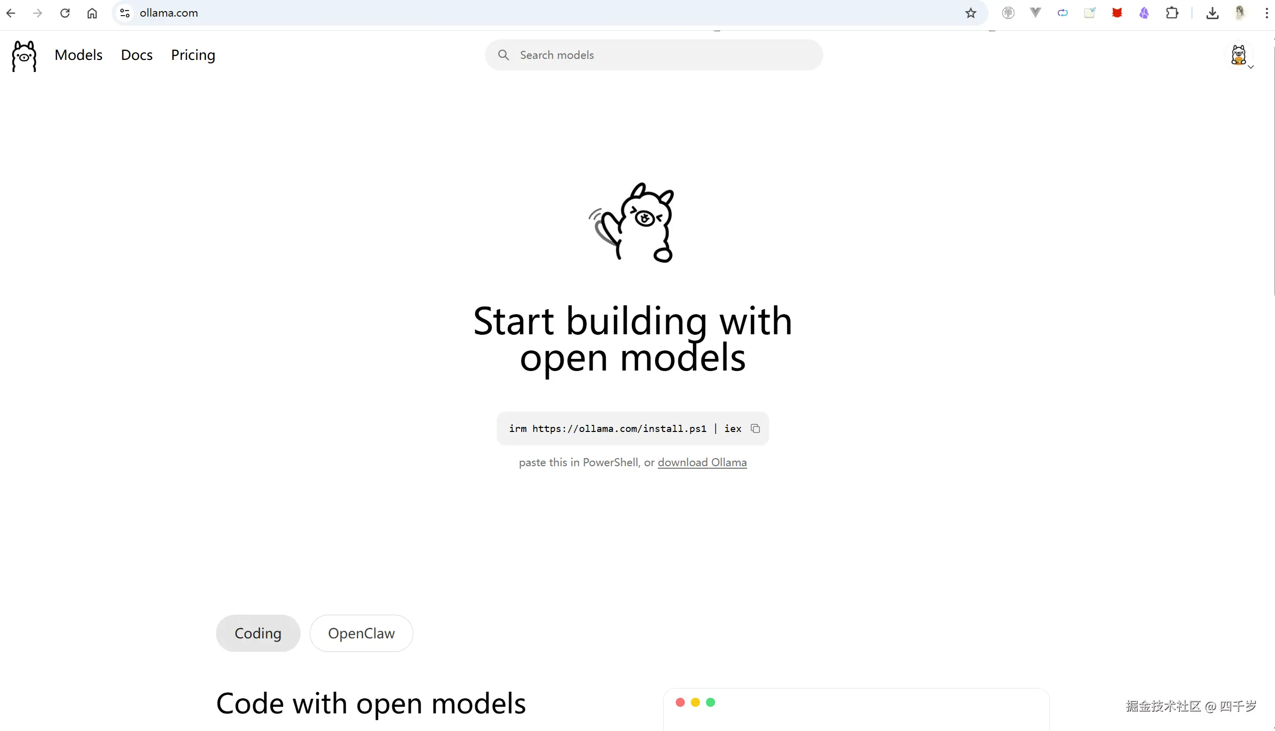 Ollama 官网Start building with open models(开始搭建开源大模型)。