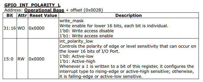 - 0:禁用双边沿检测,中断类型由int_type_low和int_polarity_low寄存器对应位决定