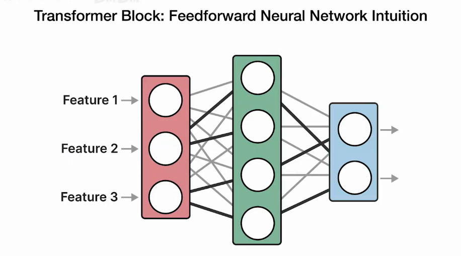 FFN = 先扩散(768→3072)给模型足够空间探索特征,再收缩(3072→768)提炼精华,配合ReLU非线性,让每个token的表示从"知道上下文"升级为"深度理解上下文"。