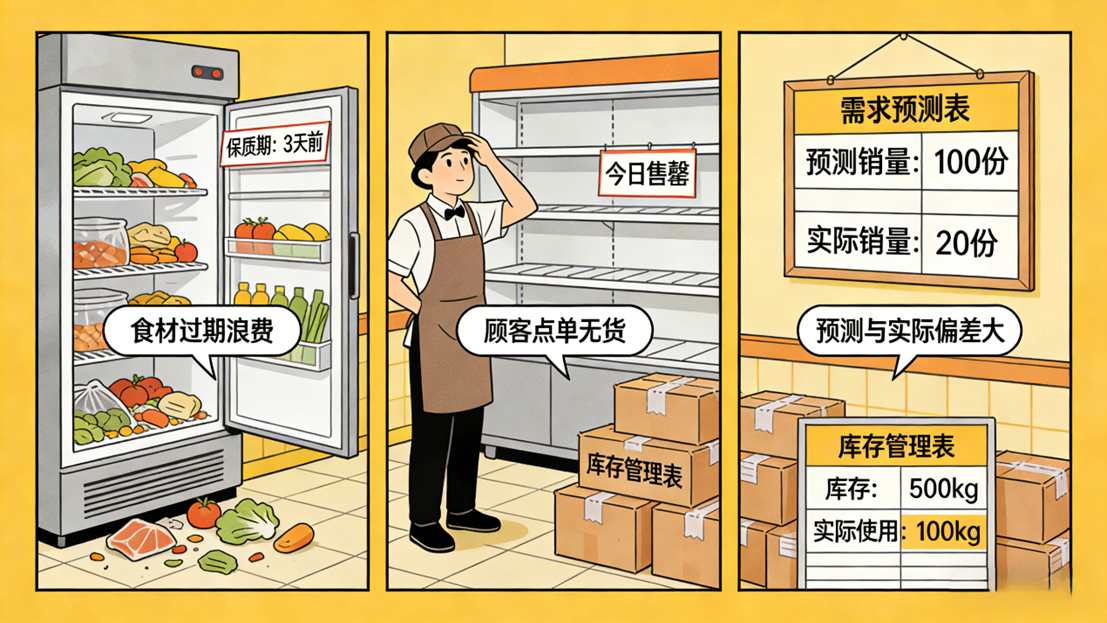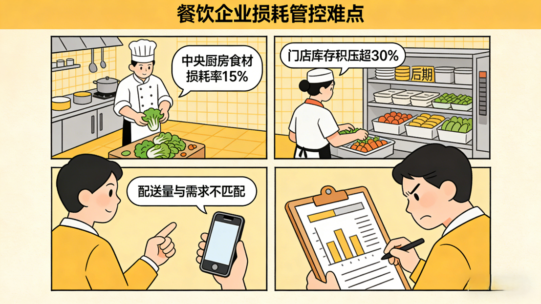 中央厨房产出计划与门店需求脱节,易造成浪费;全链路损耗缺乏科学统计管控,损耗源头无法精准定位。