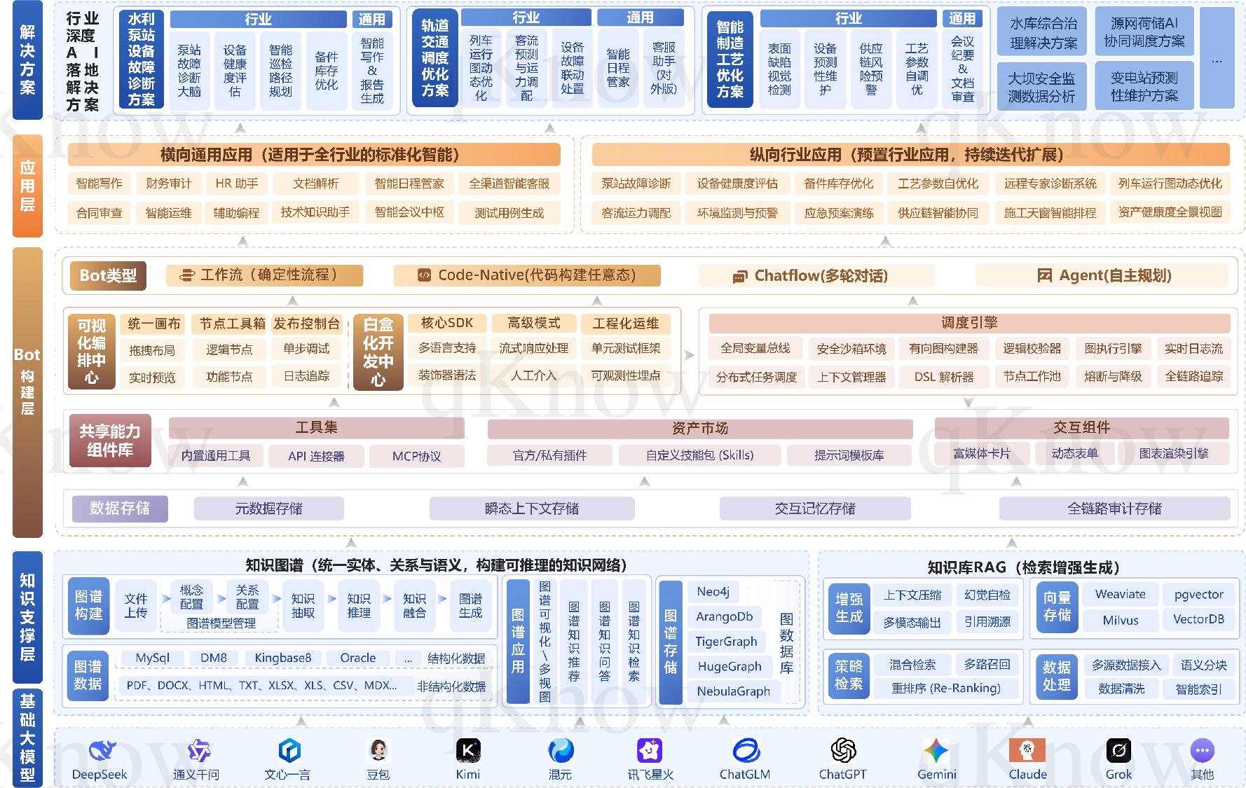 此次升级的核心,不在于单一模块的扩展,而在于平台能力体系的进一步完善。全新的 qKnow 架构,在原有知识图谱、知识库等能力基础上,新增了 Bot 构建层,强化了应用层的场景承接能力,并进一步明确了以行业深度 AI 解决方案为目标的产品方向。