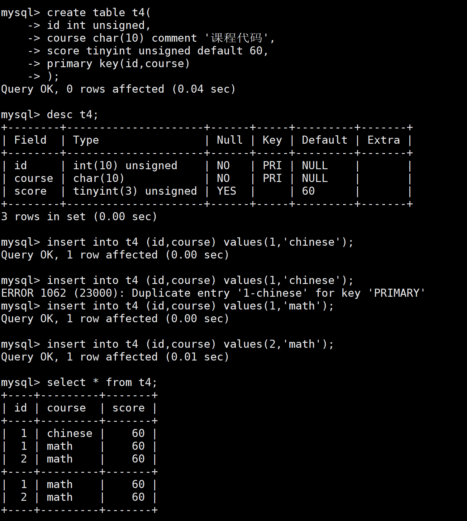 在创建表的时候,在所有字段之后,使用primary key(主键字段列表)来创建主键,如果有多个字段作为主键,