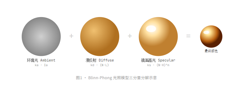 1975 年,Bui Tuong Phong 提出了著名的 Phong 光照模型。两年后,Jim Blinn 对其高光计算做出关键改进,引入了半程向量(Halfway Vector),形成了沿用至今的 Blinn-Phong 模型。它将光照分解为三个独立组件: