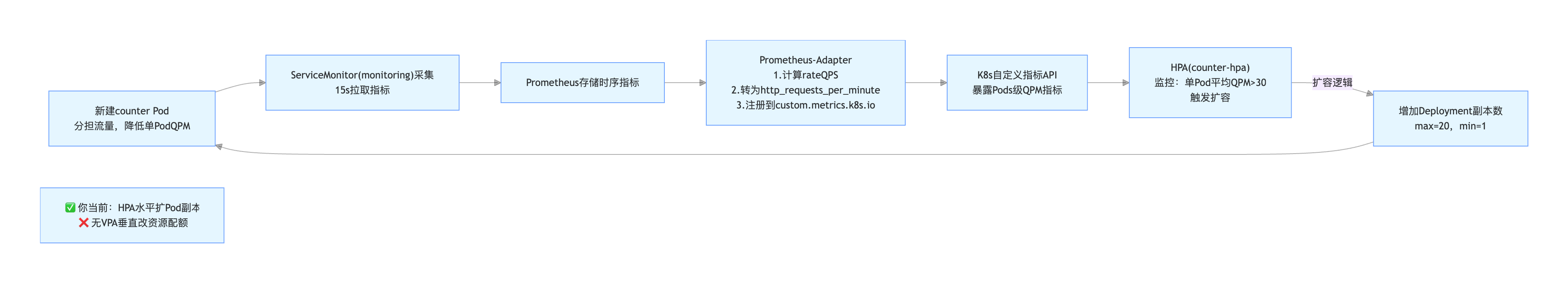 纯 HPA 玩法,水平 Pod 扩容(加副本数,1→5→20 个 Pod),你现在这套:ServiceMonitor采集指标 → adapter转自定义指标 → HPA按QPM扩副本,标准 HPA (Pod 横向扩缩容)