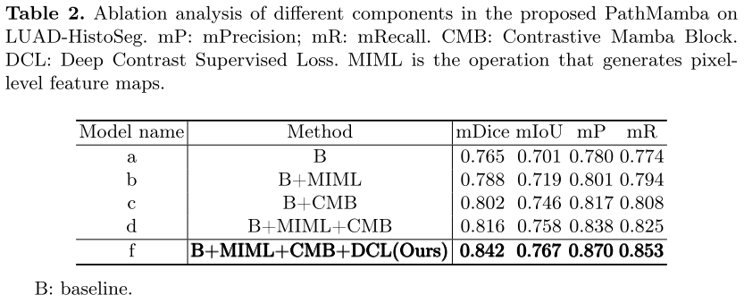 **消融研究:**我们进行消融研究,以确定单个组件的效率并确定最佳设置。表2显示了包括多实例多标签学习(MIML)、对比Mamba块(CMB)和深度对比度监督丢失(DCL)等几个组件对分割性能的影响。引入由MIML(模型b)创建的像素级特征地图改进了Dice,展示了像素级粒度的好处。模型c和d表明,加入CMB提高了分割精度,展示了全局建模和特征表示的双粒度对比学习的有效性。此外,利用动态链接库对模型f的性能进行了优化。我们认为这是因为DCL使网络能够有效地提取目标信息,而不需要依赖于像素级标记。结果表明,对于多类病理图像,弱监督分割方法在配对对比视觉Mamba时优于单粒度基线。