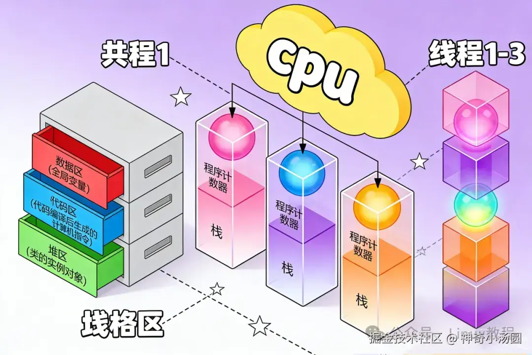 进程虽能实现 "独立运行",但切换开销太大。为解决 "轻量化执行" 需求,线程(Thread)作为 "进程内的执行分支" 应运而生,类比车间里的 "生产线"------ 共享车间资源,仅保留专属执行工具。