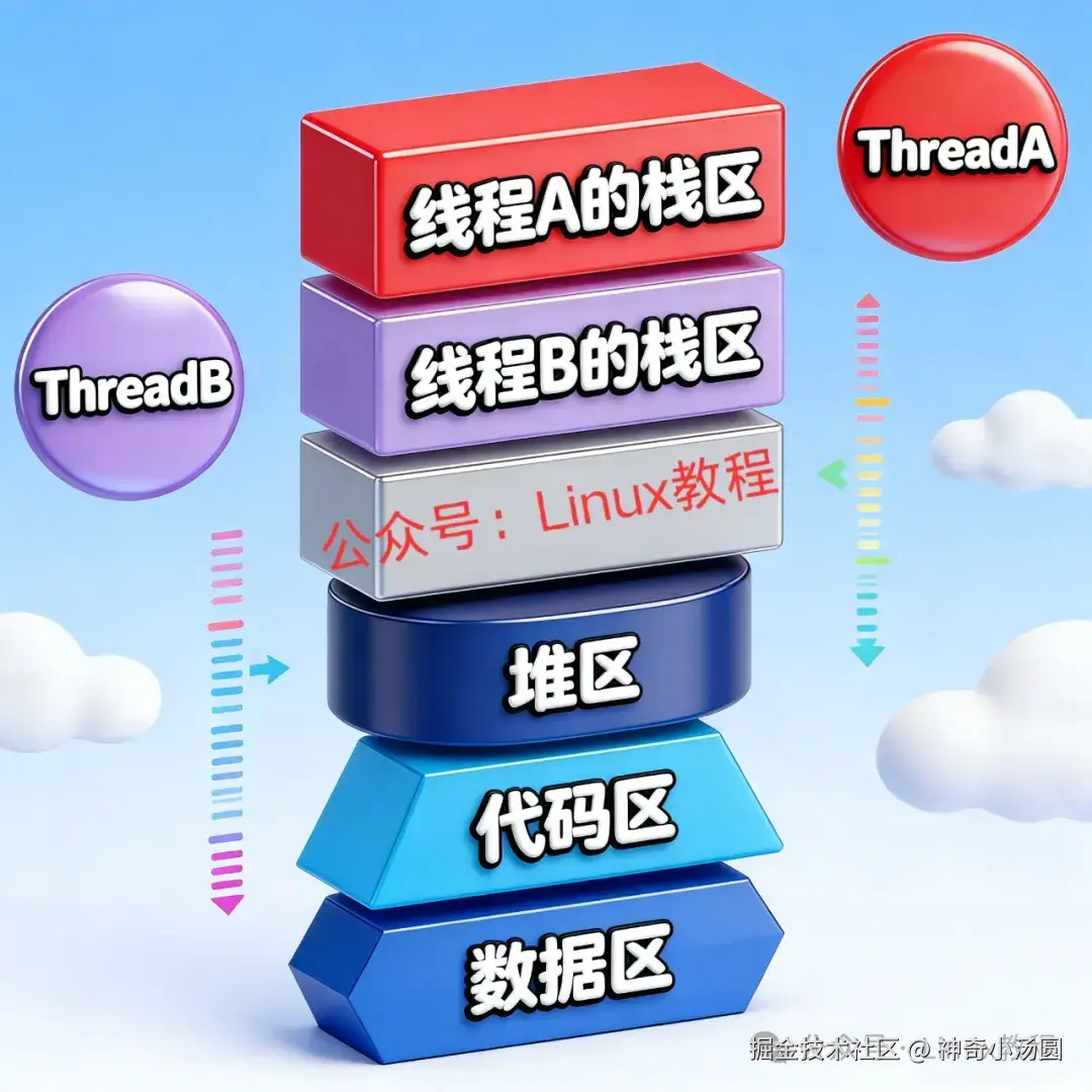 代码区存编译后的机器指令(如thread_func函数),同一进程内的线程可直接调用任意函数 ------ 类比所有生产线共用一本 "设计图",无需单独复印。