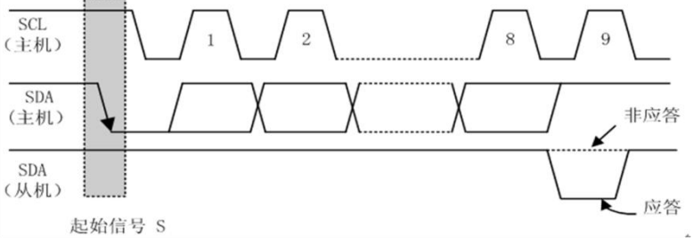 SCL 线为高电平期间,SDA 线由高电平向低电平的变化表示起始信号 ,SDA 线由低电平向高电平的变化表示终止信号 ,如图: