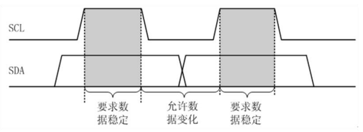 I2C 总线进行数据传送时,时钟信号为高电平期间,数据线上的数据必须保持稳定,只有在时钟线上的信号为低电平期间,数据线上的高电平或低电平状态才允许变化,每次数据传输都以字节为单位,每次传输的字节数不受限制,如图