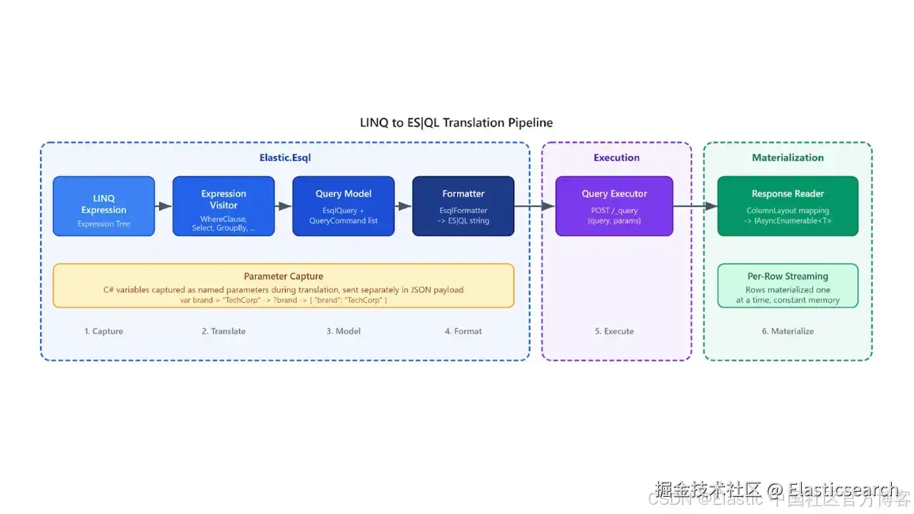 从 v9.3.4 和 v8.19.18 开始,Elasticsearch 的 .NET 客户端包含一个 Language Integrated Query(LINQ)提供程序,可在运行时将 C# LINQ 表达式 转换 为 Elasticsearch Query Language(ES|QL)查询。你无需手动编写 ES|QL 字符串,而是使用 Where、Select、OrderBy、GroupBy 等标准操作符来构建查询。该提供程序负责处理转换、参数化以及结果反序列化,包括逐行流式处理,从而在结果集规模变化时仍保持内存使用恒定。