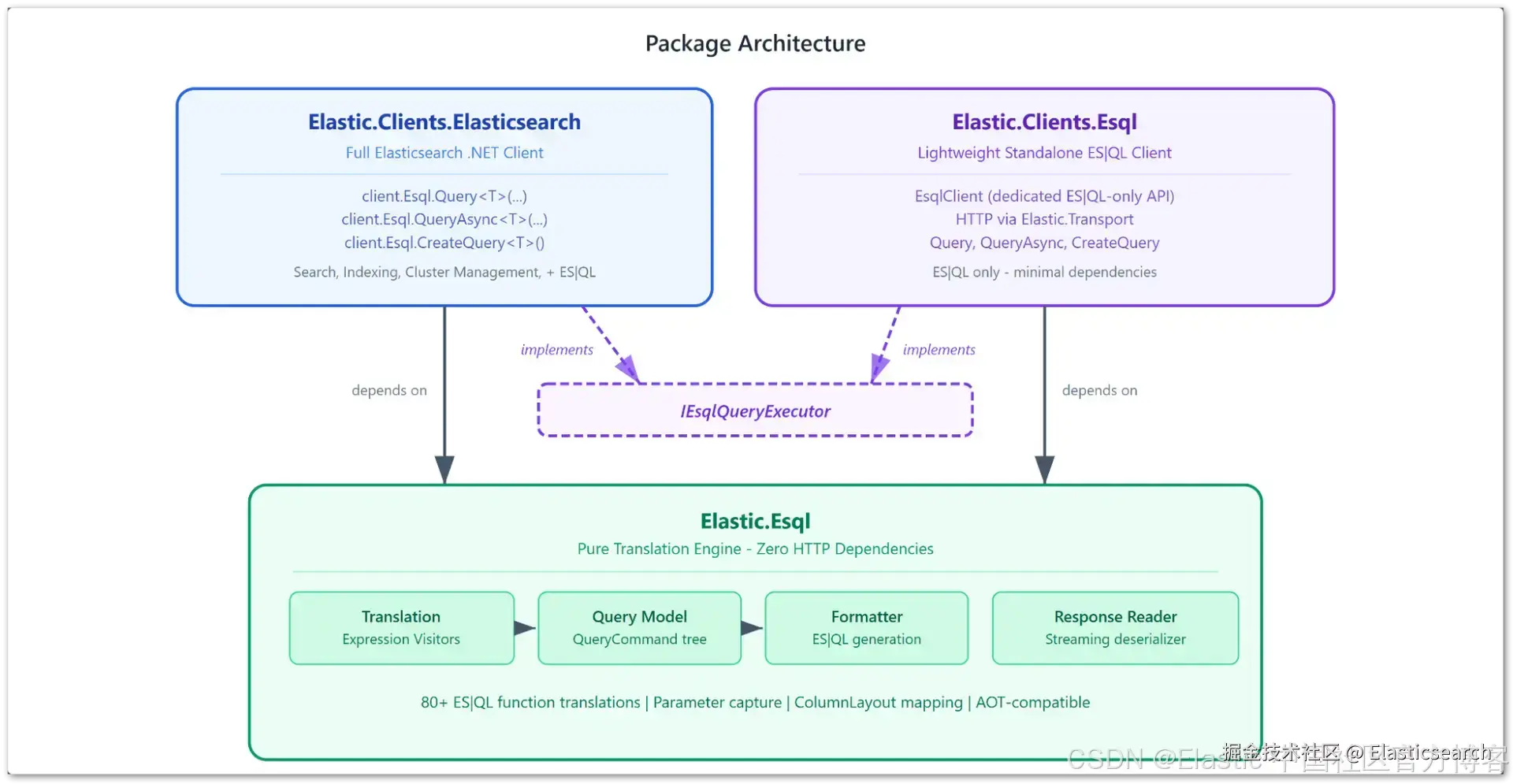 Elastic.Esql 是纯翻译引擎。它没有任何 HTTP 依赖,并包含 expression visitors、 query model、formatter 和 response reader。你可以独立使用它来构建和检查 ES|QL 查询而无需 Elasticsearch 连接,这对于测试、查询记录或构建你自己的执行层非常有用。