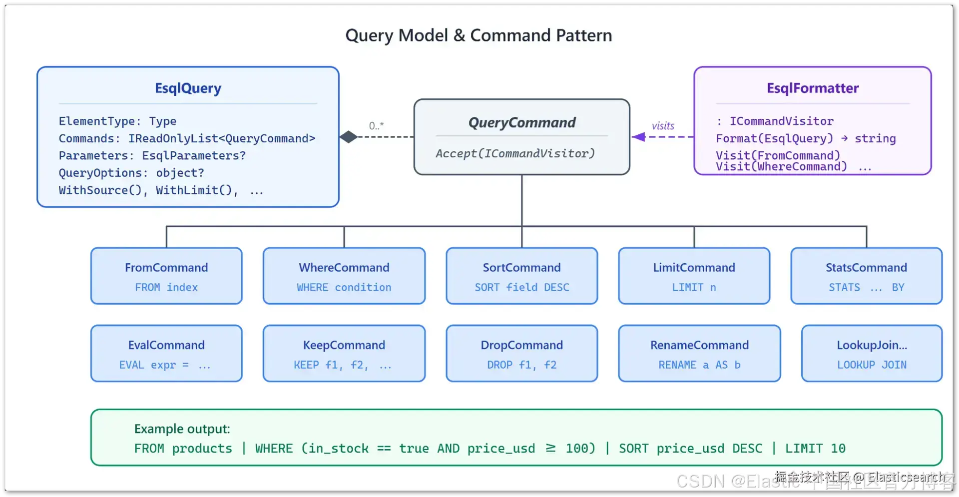 访问器不会直接生成字符串。相反,它们会生成 QueryCommand 对象,这是一个不可变的中间表示。包括 FromCommand、WhereCommand、SortCommand 和 LimitCommand,每个代表一个 ES|QL 处理命令。这些命令被收集到一个 EsqlQuery 模型中。
