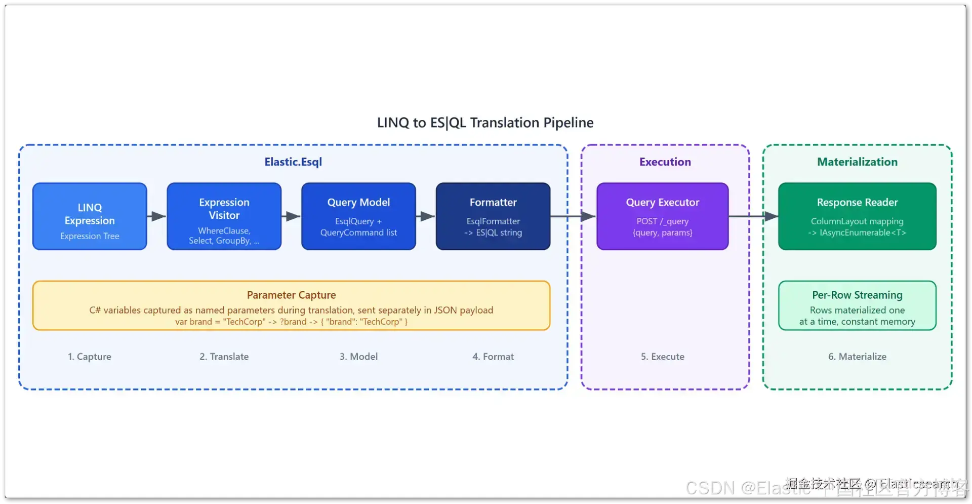 格式化后的 ES|QL 字符串以及捕获的参数被作为 JSON payload 发送到 Elasticsearch 的 /_query 端点。IEsqlQueryExecutor 接口抽象了传输层,这也是分层包架构发挥作用的地方。