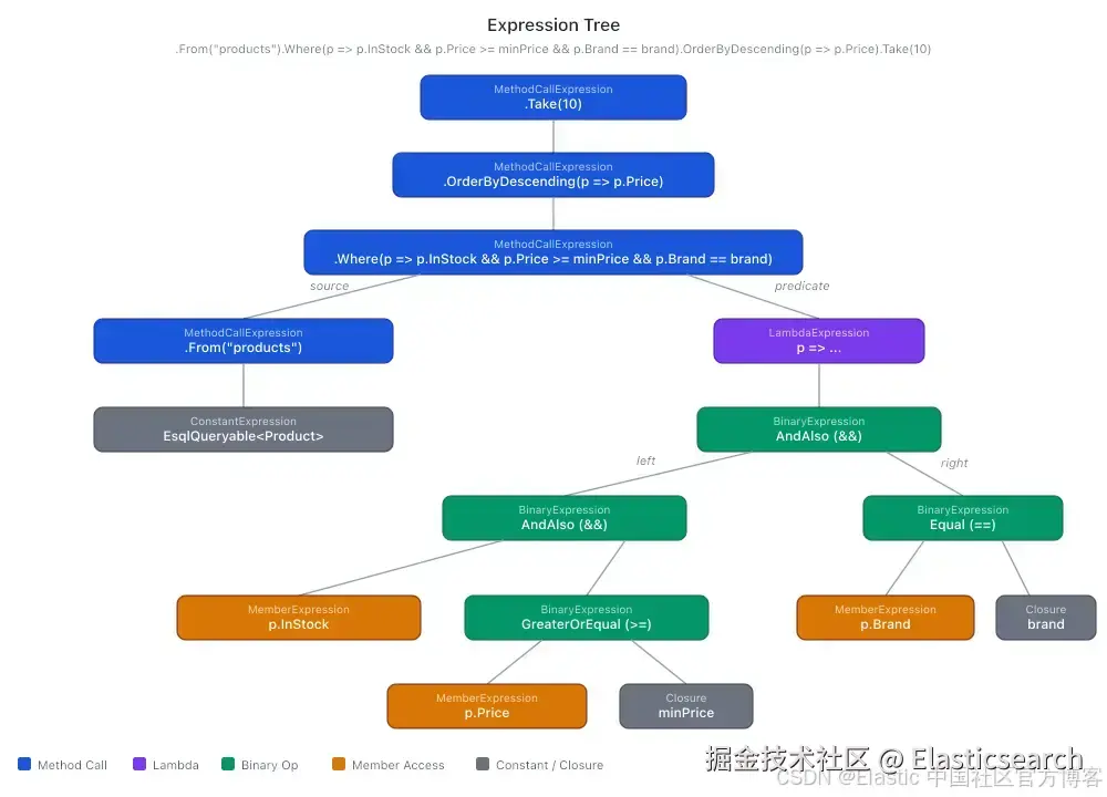 该树是由内向外嵌套的:Take 包裹 OrderByDescending,后者包裹 Where,再包裹 From,最终包裹根节点 EsqlQueryable 常量。Where 谓词本身也是一个子树,由表示 &&、>= 和 == 运算符的 BinaryExpression 节点组成,其叶子节点为用于属性访问的 MemberExpression,以及用于捕获 minPrice 和 brand 变量的闭包。这正是提供程序遍历以生成最终 ES|QL 的数据结构。