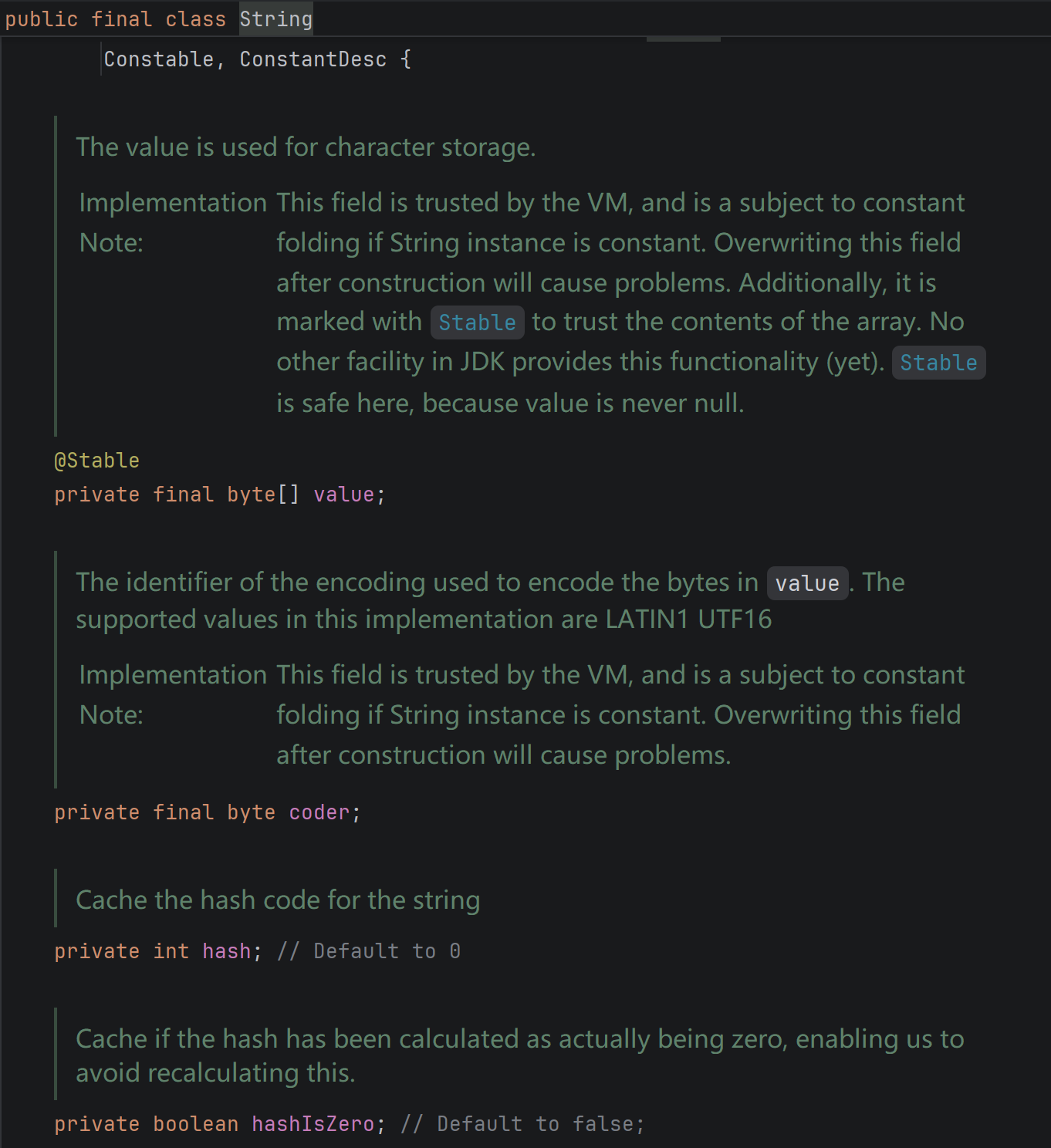 该版本在 Java 9 的基础上,新增了 boolean 类型的 hashIsZero 字段,核心作用是区分两种场景:"哈希值未计算(默认值 0)"和"哈希值已计算且结果为 0"。避免了因字符串哈希值恰好为 0 时,每次调用 hashCode() 方法都重复计算的问题,进一步优化了 hashCode() 的性能,底层存储结构未发生其他变化。