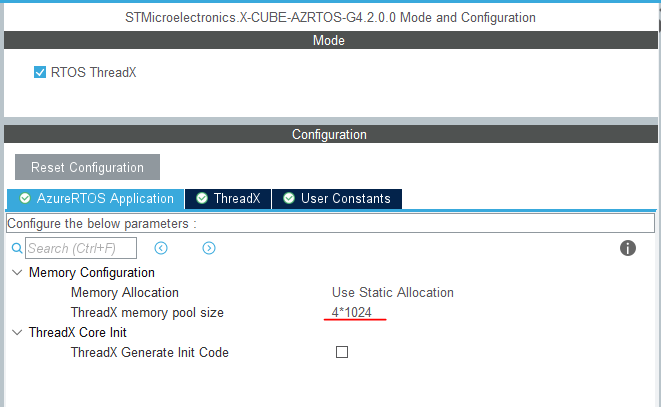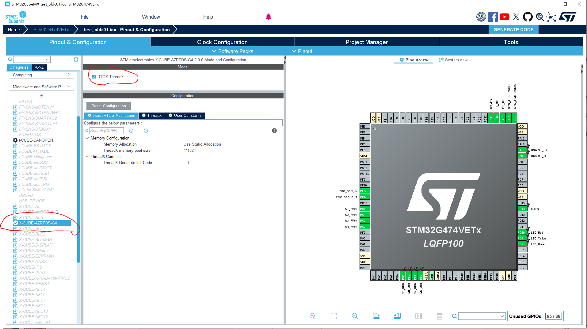 这里选好之后,那么在cubeMX的中间件和软件包里,应该有【X-CUBE-AZRTOS-G4】这个选项,那么勾选好【RTOS ThreadX】就行。