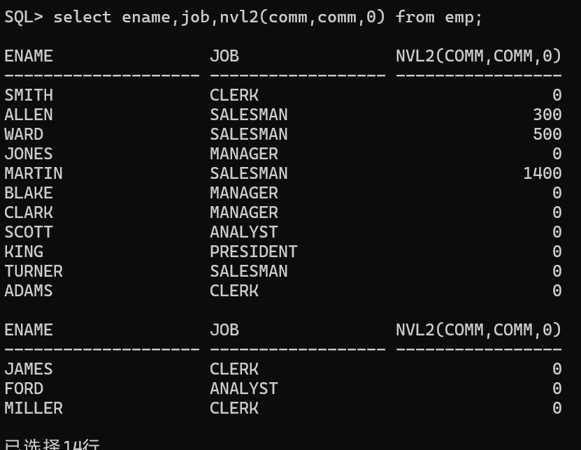 依然是使用同nvl()相同的示例,如果comm为空返回0,不为空返回comm本身,同nvl()一样,返回的值也可自定义,下方示例空值返回为0