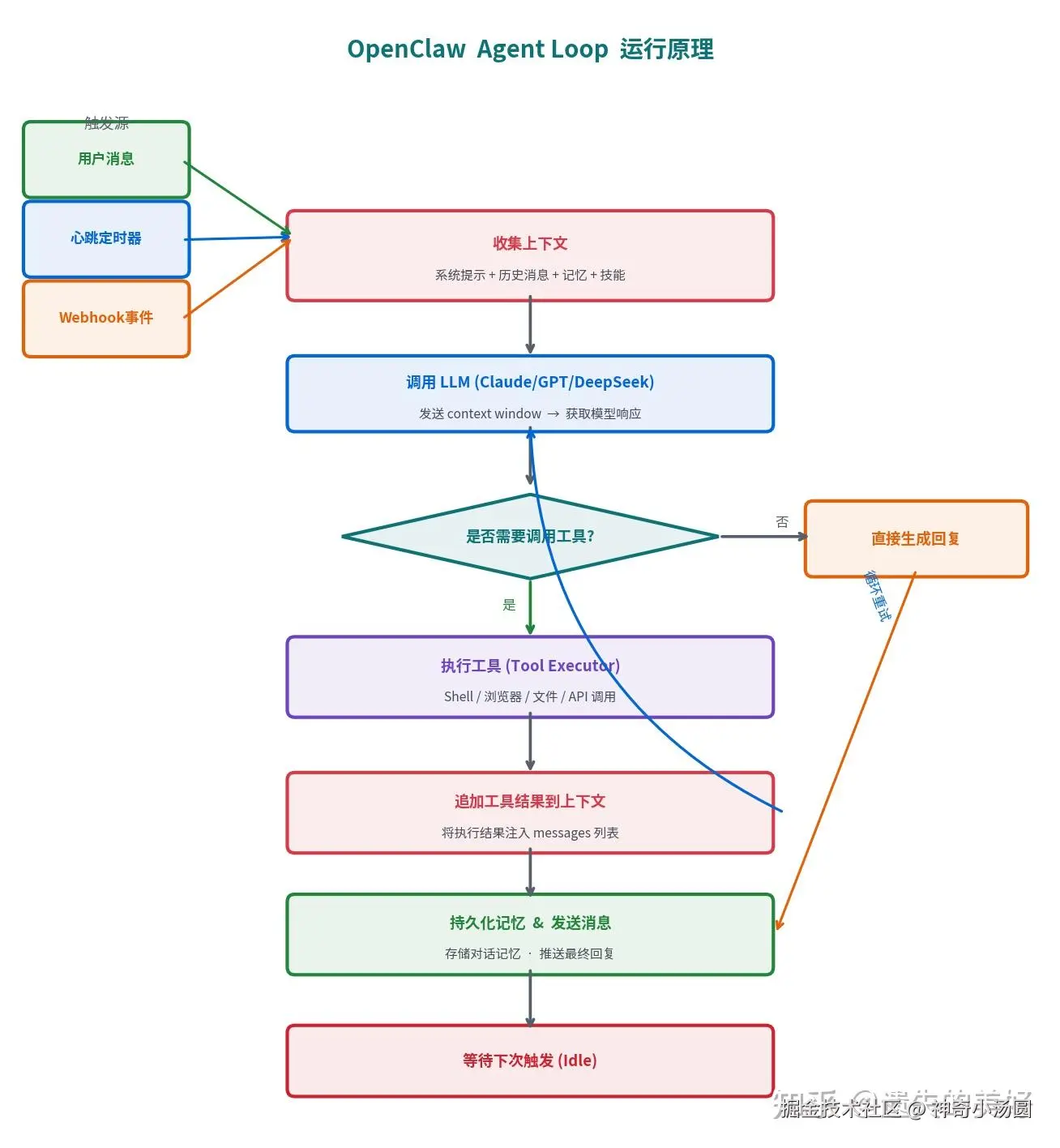 这是 OpenClaw 最核心的组件,下文将专章详述。简单说,它是一个持续运转的"思考-行动"循环,驱动 AI 不断推理、调用工具、处理结果,直到完成任务。